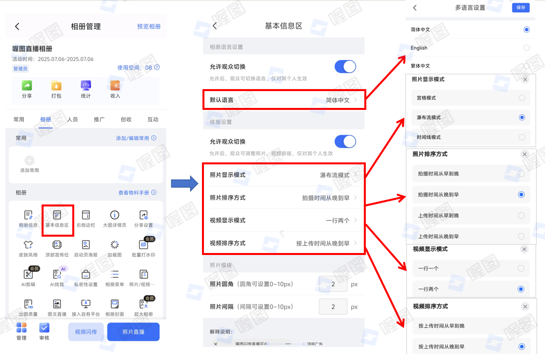 - APP端:相册创建者点击“相册-基本信息区”——点击“相册语言设置”或“相册照片/视频排版设置”——进行调整