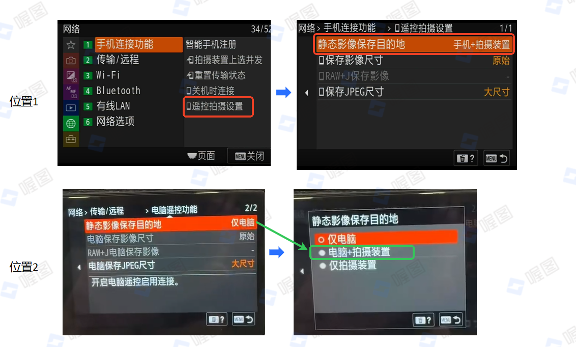 (4)边拍边传,需设置“静态影像保存目的地”更改为“电脑/手机/目的地+拍摄装置”(⚠️若无此设置请勿边拍边传,会导致存储卡内不存图片)