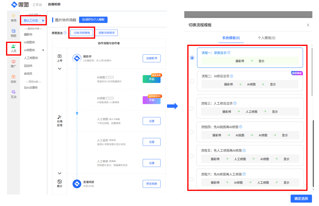 1、协作流程环节开启后(AI/人工),请及时添加人员或设置AI工具,以确保图片能正常处理。如选了 “人工修后显示”,一定要在【人员管理】里添加至少 1 名修图师,不然图片会停在该环节;