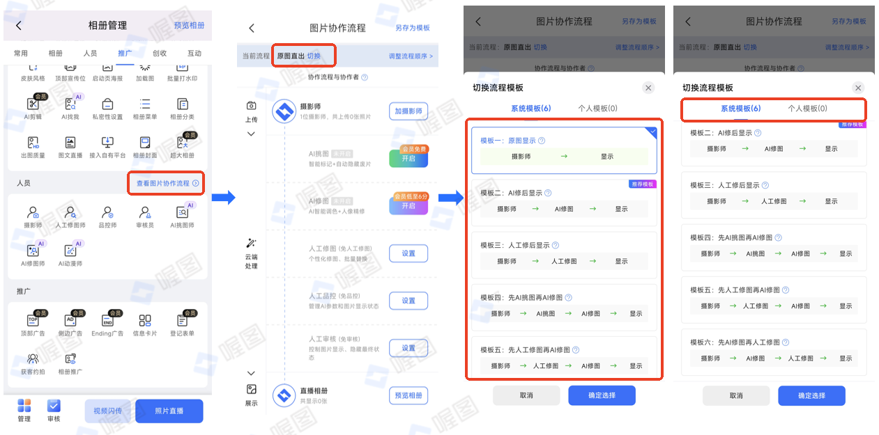 - APP端:相册创建者点击“查看图片协作流程”——点击“切换”——切换其他模板流程(可选系统模版、个人模版);