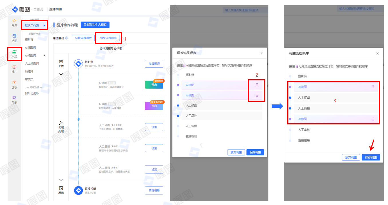 - PC端:相册创建者点击“人员-默认工作流”——点击“调整流程顺序”——可任意调节AI挑图和AI修图的顺序,可调整至人工修图后、人工品控后——点击“保存调整”;