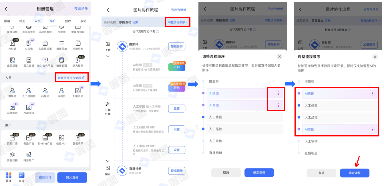 - APP端:相册创建者点击“查看图片协作流程”——点击“调整流程顺序”——可任意调节AI挑图和AI修图的顺序,可调整至人工修图后、人工品控后——点击“确定调整”;