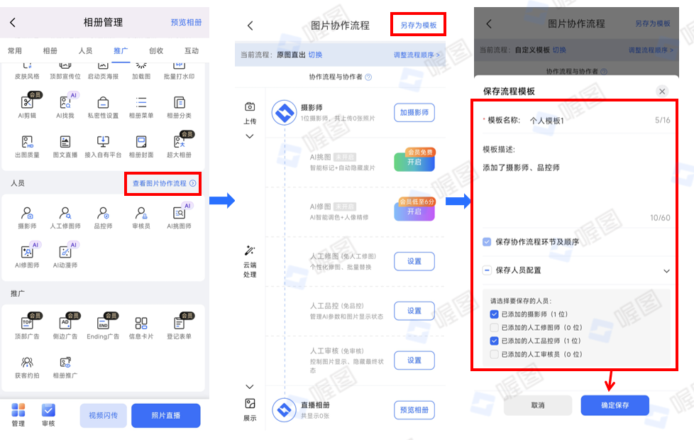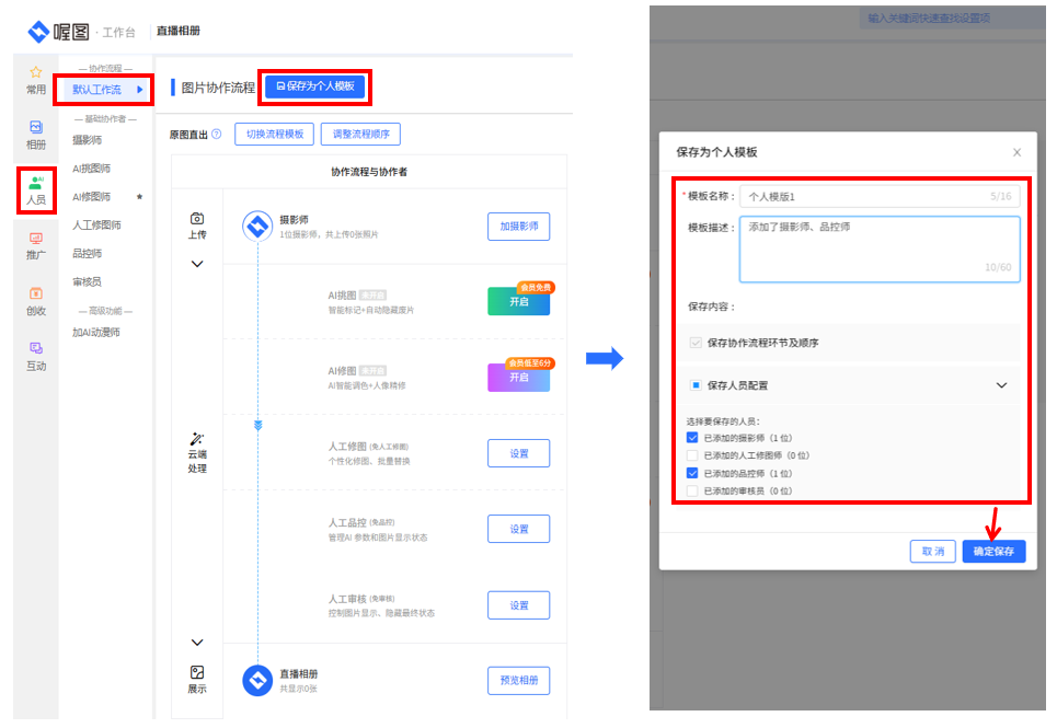 - PC端:相册创建者点击“人员-默认工作流”——点击“保存为个人模版”——填写模版名称和描述,可勾选是否保存人员配置(已添加的摄影师、人工修图师、品控师、审核员)——点击“确定保存”;