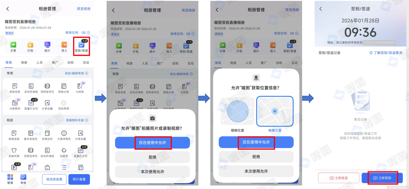 - APP端:相册创建者打开喔图-照片直播平台APP——进入工作台——点击对应相册——点击“签到/签退”——授权允许喔图拍摄照片或录制视频、获取位置信息的权限——点击“立即签到”,拍照进行签到;