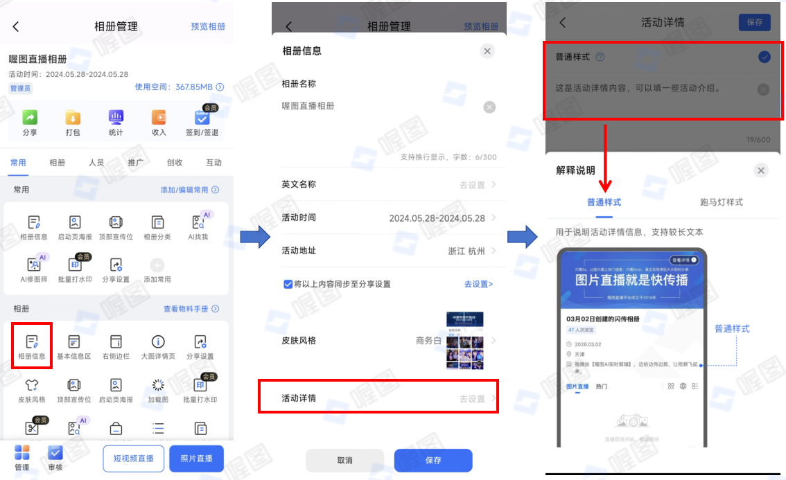 - APP端:相册创建者点击“相册-相册信息”——选择活动详情——选择“普通样式”,并在编辑框内输入内容——点击“保存”