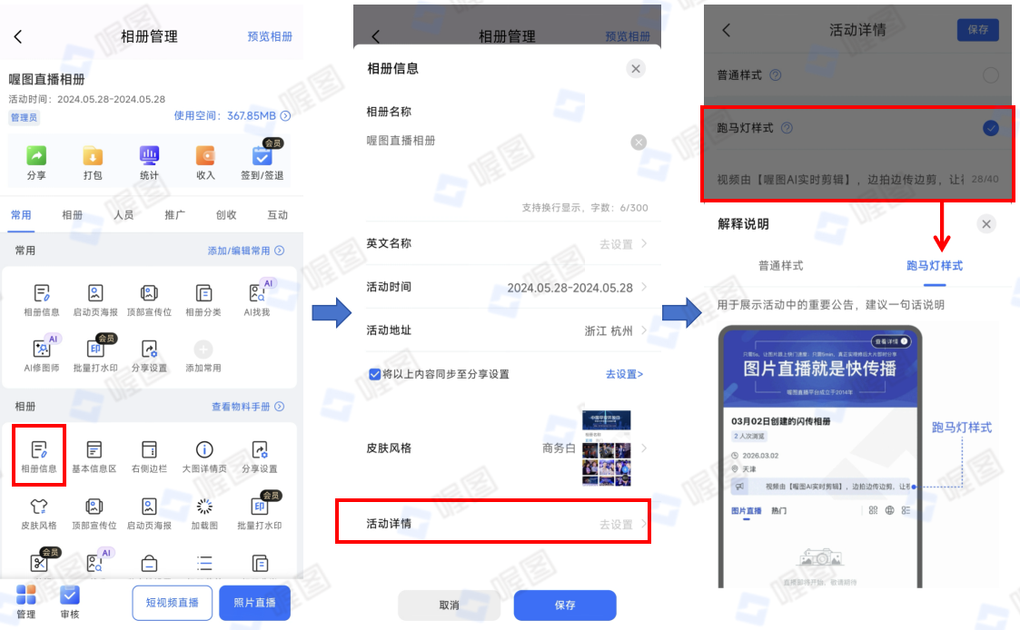 - APP端:相册创建者点击“相册-相册信息”——选择活动详情——选择“跑马灯样式”,并在编辑框内输入内容——点击“保存”