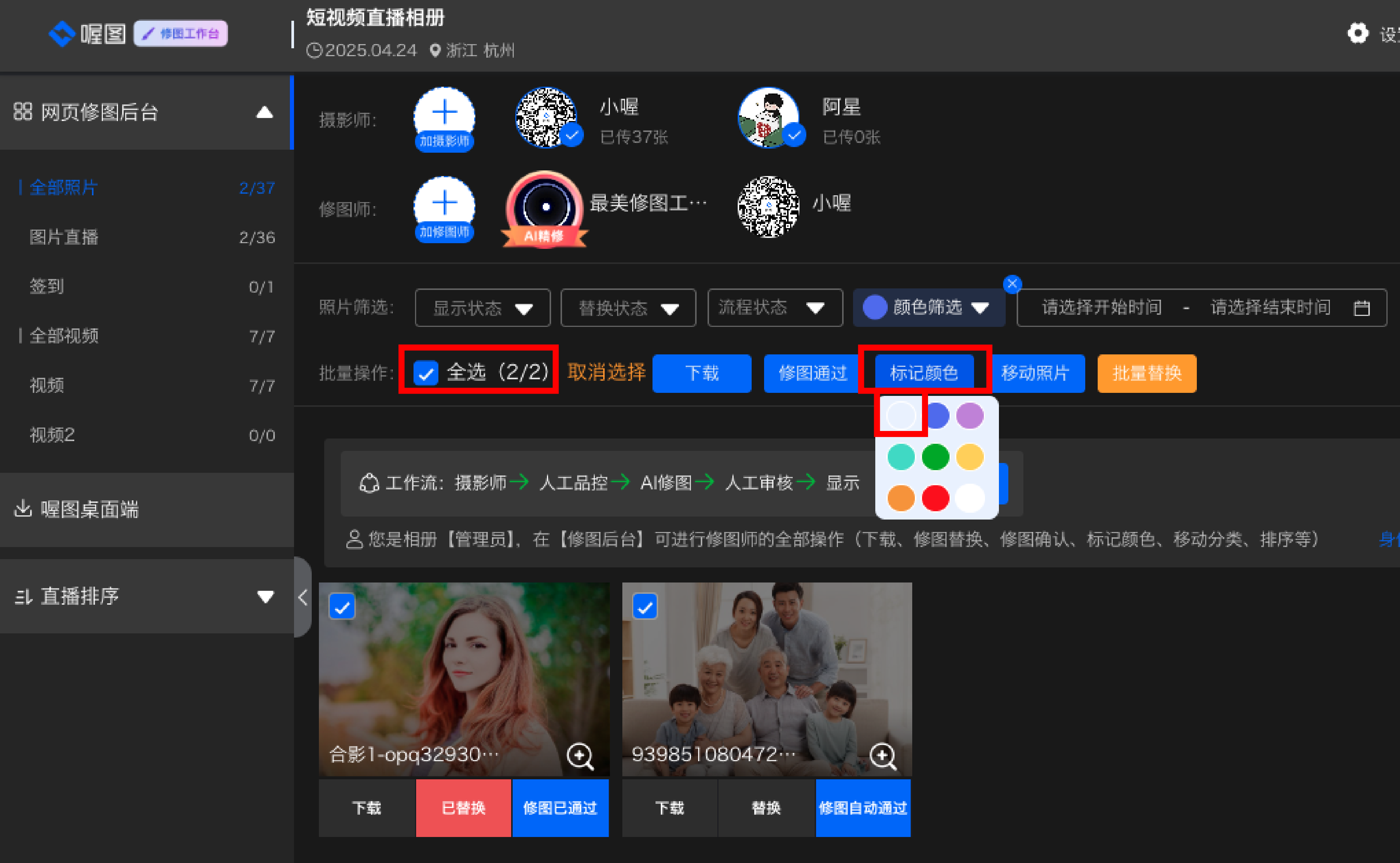6)可以在修图后台勾选图片,然后点击右上角的【标记颜色】按钮,选择第一个空颜色,即可取消颜色标记。