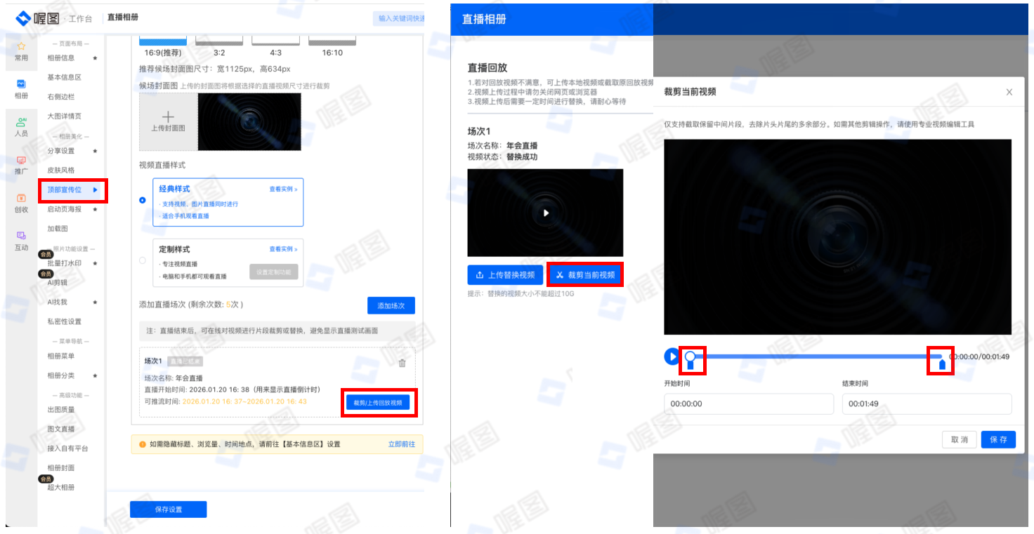 - PC电脑网页端:点击“相册-顶部宣传位”——选择“视频直播”——下滑找到要替换的视频直播场次,点击“裁剪/上传回放视频”——点击“裁剪当前视频“ , 裁头去尾后保存回放。