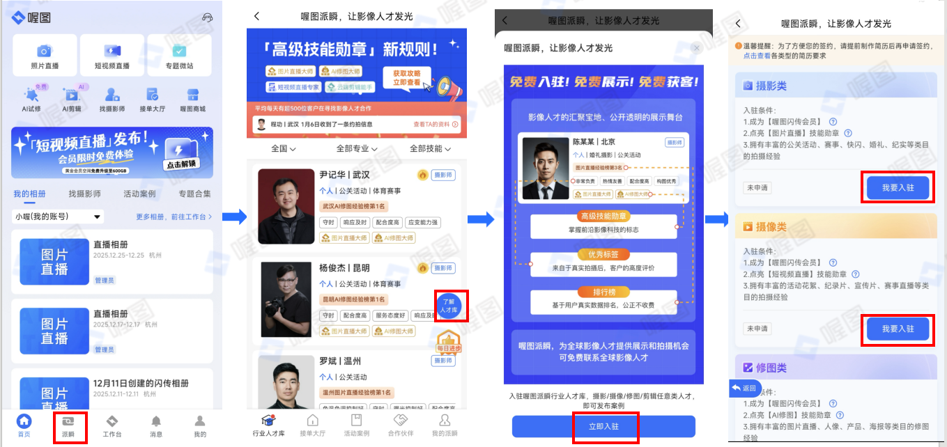 - 喔图APP端:打开喔图App点击“派瞬”—点击“了解人才库”—点击“立即入驻”,选择要签约的门类有摄影、修图、视频、剪辑等类别,点击“我要入驻”;