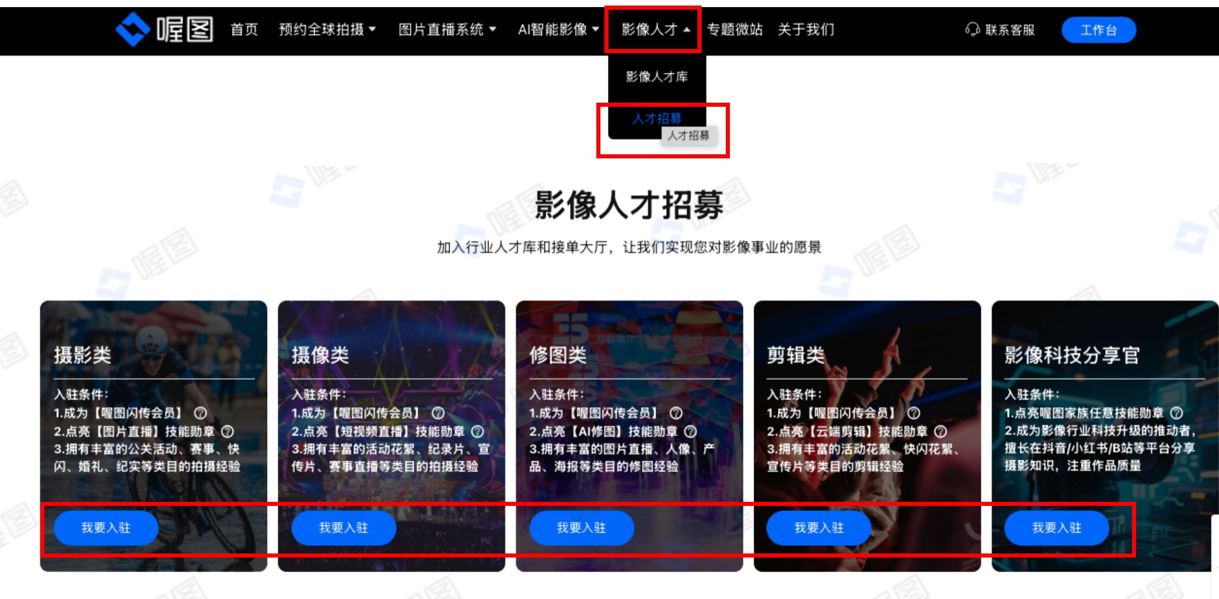 - 电脑网页端:官网点击“影像人才—人才招募”,选择要签约的门类有摄影、修图、视频、剪辑等类别,点击“我要入驻”;