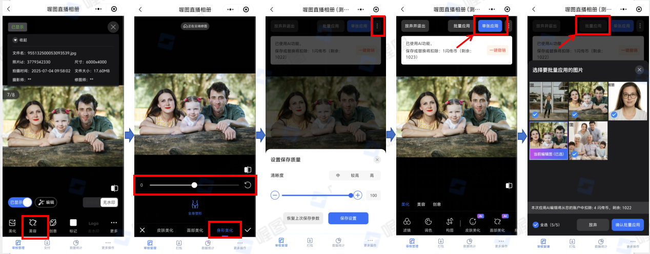 - 身形美化功能支持“批量应用”,选择要批量应用的图片,确认参数,确认替换后将依据您的身份变更对应照片环节状态