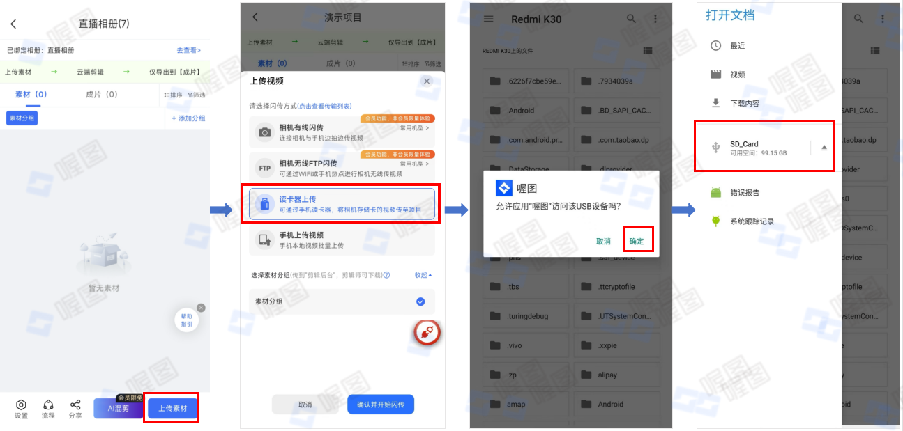 - 安卓端:打开喔图APP——点击“工作台”并选择相册——点击“短视频直播”——点击“需要剪辑”和“视频上传至项目”——点击“上传素材”——点击“读卡器上传”——插上OTG数据线,并允许喔图访问USB设备——点击确定后,自动调用手机文件夹页面,选择“SD_Card”——选择文件夹【DICM】,选择文件夹【DJI_001_A01】——长按页面单选视频或全选视频——点击“上传”;