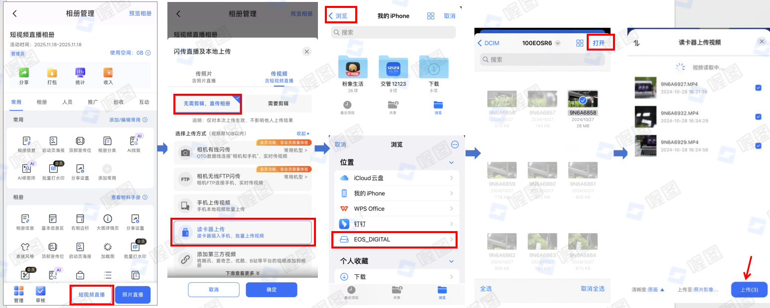 - IOS端:打开喔图-照片直播平台APP——点击“工作台”并选择相册——点击“短视频直播”——选择“无需剪辑直传相册”和“读卡器上传”——点击左上角的“浏览“,然后在“浏览”下找到读卡器,单选或多选视频——点击“上传”