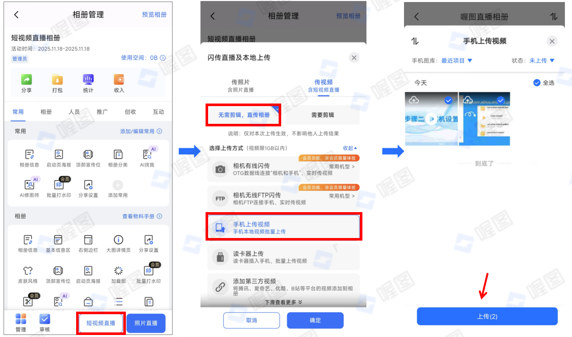 - APP端:打开喔图-照片直播平台APP——登录个人账号,点击“工作台”——点击对应相册——点击“短视频直播”——选择“无需剪辑直传相册”和“手机上传视频”,点击“确定”——可以设置视频标题和封面——点击”“保存”
