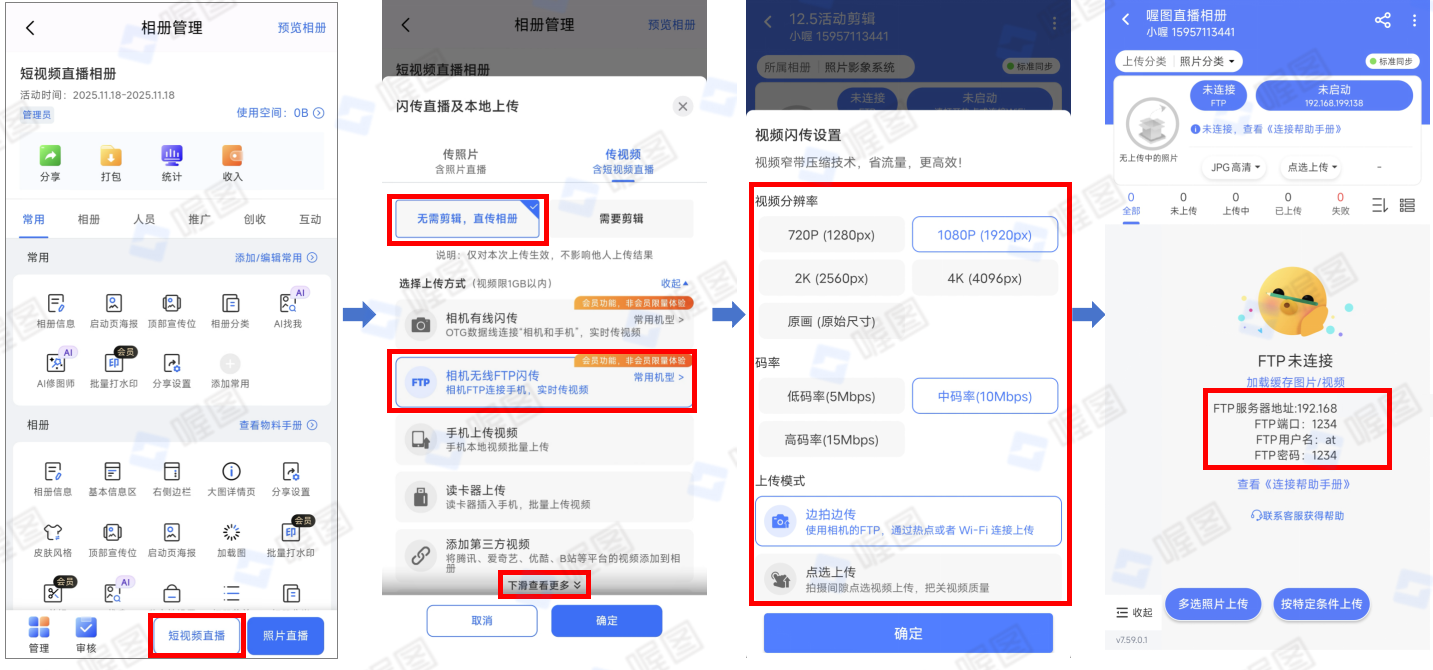 步骤:打开喔图-照片直播平台APP——点击“工作台”并选择相册——点击“短视频直播”——选择“无需剪辑直传相册”和“相机无线FTP闪传”(会员功能),选择“1080P”、“中码率或高码率”和“边拍边传”;