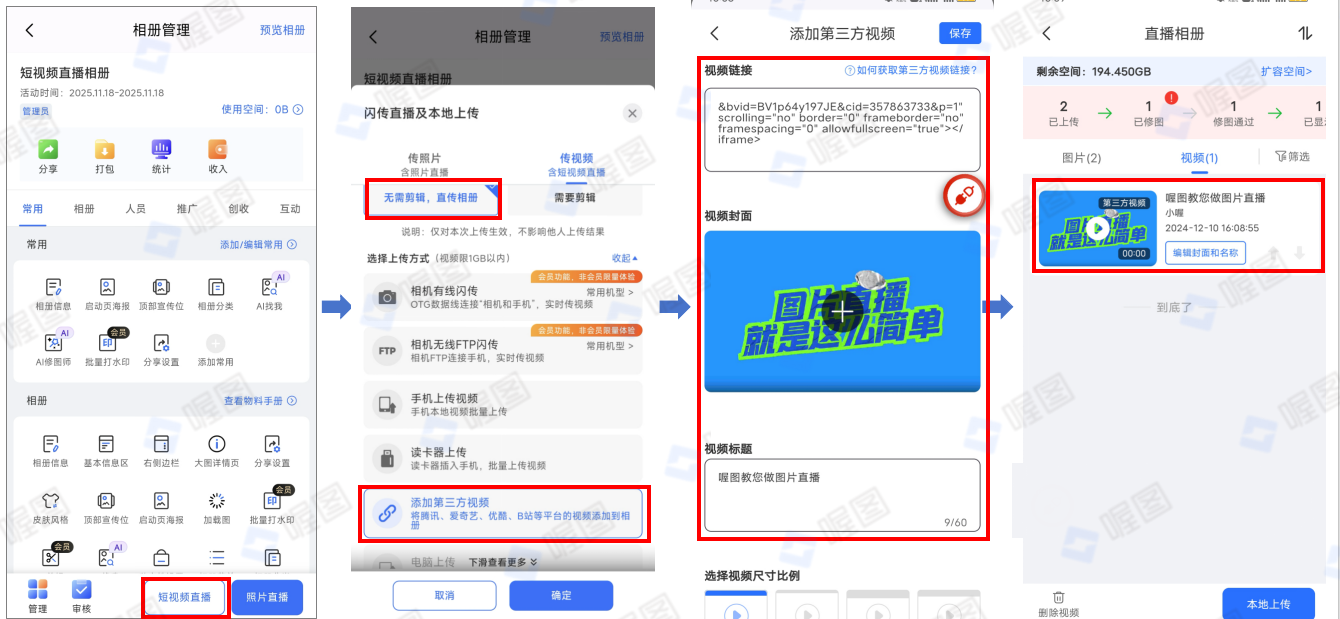 - 安卓端:打开喔图-照片直播平台APP——点击“工作台”并选择相册——点击“短视频直播”——选择“无需剪辑直传相册”和“添加第三方视频”——填写第三方视频链接、视频标题,设置视频封面和视频尺寸比例