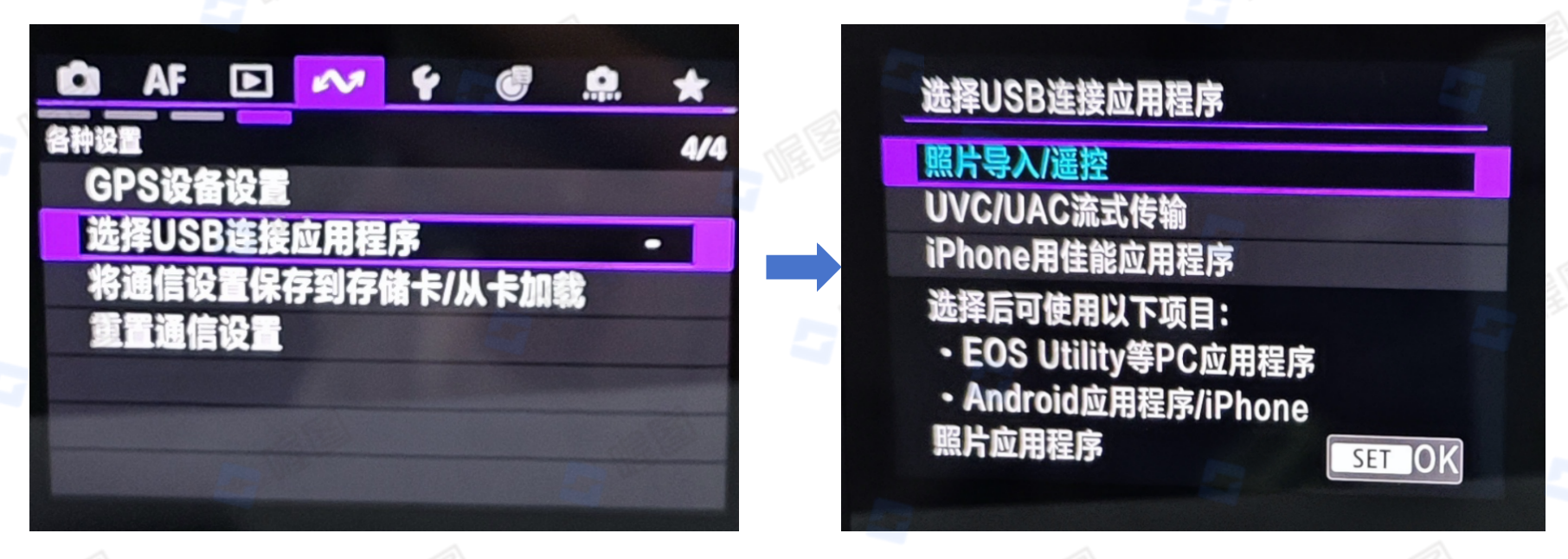 大部分佳能相机,可以直接插线连接传图;需要注意的佳能R62、佳能R63、佳能R7、佳能R8,需要设置“选择USB应用程序”——“照片导入/遥控”