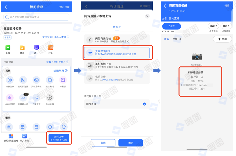 启动喔图-照片直播平台APP,在相册列表中点击进入待上传相册——点击"实时上传"——选择“无线FTP闪传”,选择正确传输分类——进入FTP模式的闪传页面, 请记录自己手机连接页面中的关键数据:FTP服务器地址、FTP端口、FTP用户名、FTP密码