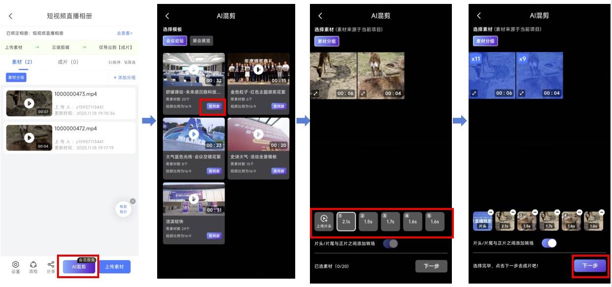 步骤:点击“AI混剪”——选择模版剪同款——上传片头,并点击视频素材添加——选择是否开启转场的按钮——点击下一步,然后导出高清成片;
