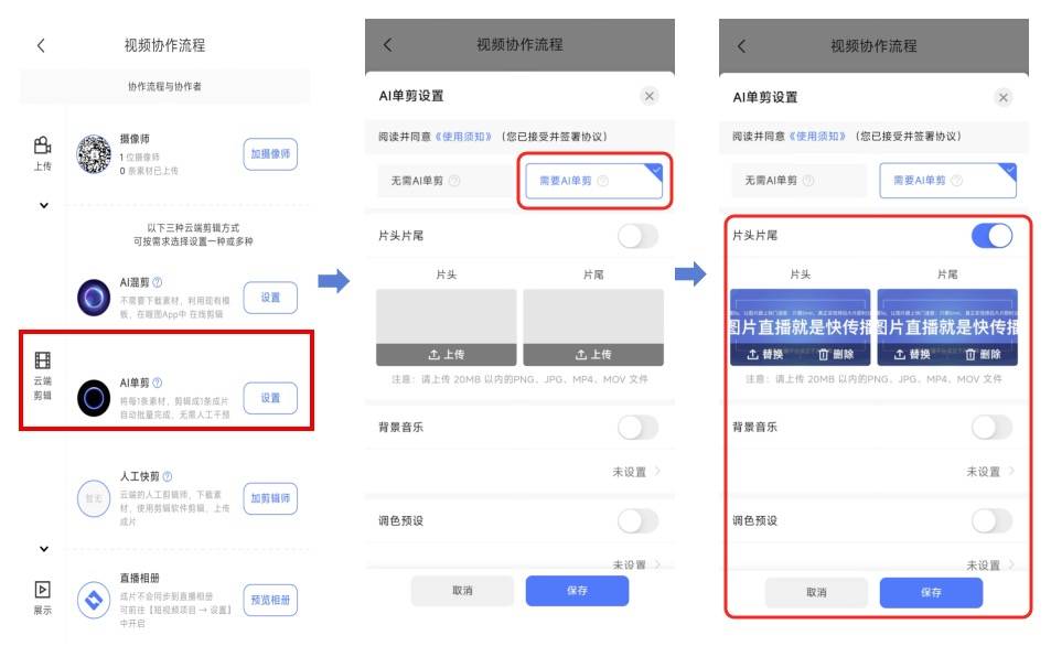 步骤:在流程中,选择“云端剪辑-AI单剪”——选择“需要AI单剪”——设置片头片尾、背景音乐、调色预设等;设置并开启后,新上传的素材将会自动添加已设置的内容进行批量成片;