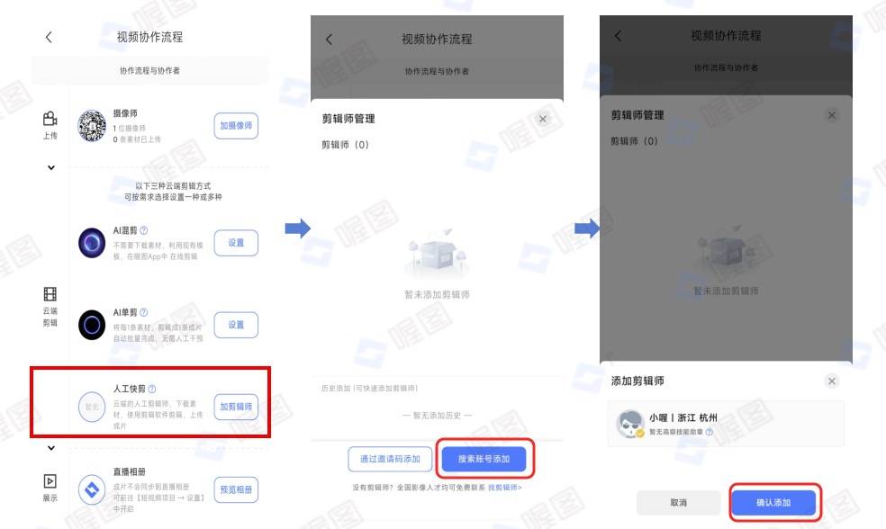 步骤:在流程中,选择“云端剪辑-人工快剪”——点击“搜索账号添加”,确认添加;剪辑师下载喔图桌面端,找到项目「开始工作→设置目录」实时下载素材本地剪辑。