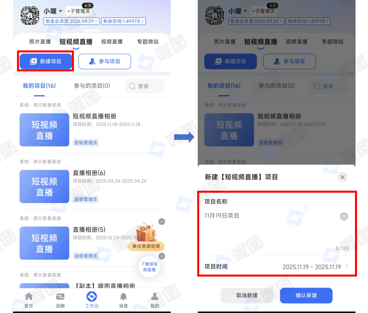 步骤:打开喔图-照片直播平台APP——点击“工作台”并选择“视频闪传”——点击上方的“新建项目”——设置项目名称和时间;