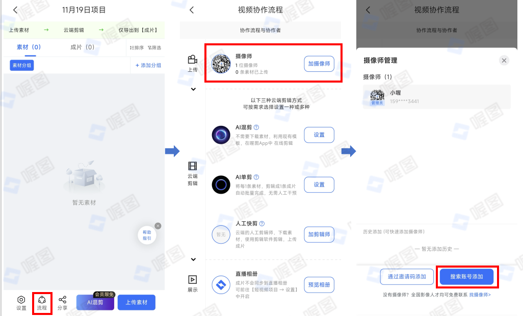 步骤:点击“工作台”并选择“短视频直播”——点击创建好的项目,点击“流程”——点击加摄像师,搜索账号添加;