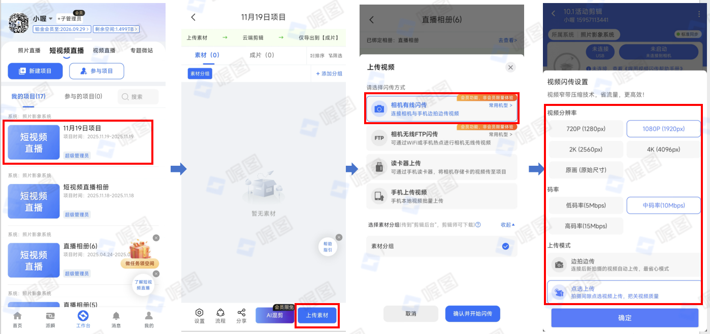 步骤:打开喔图-照片直播平台APP——点击“工作台”并选择“短视频直播”——点进相册,点击“上传素材”——选择“相机有线闪传”,选择“1080P”、“中码率或高码率”和“点选上传”;