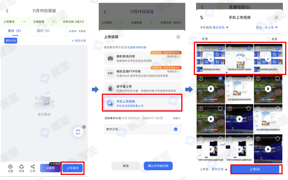 - APP端:打开喔图-照片直播平台APP——点击“工作台”并选择“短视频直播”——点进相册,点击“上传素材”——选择“手机上传视频”;